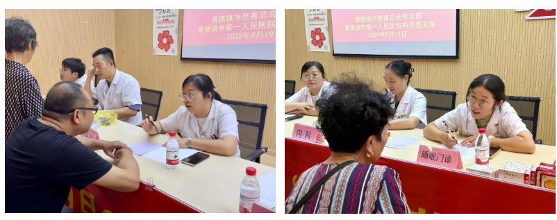 本次活动的亮点之一是特别设置的“药事咨询台”。由市一院资深药师团队现场坐诊,为居民提供合理用药科普与一对一专业咨询。药师团队积极开展药物科普宣传,通过发放合理用药知识宣传单、现场讲解常见药物误区等形式,帮助居民提高用药安全意识,减少用药错误。景德镇市慈善总会的党员志愿者们也全程协助活动有序开展,并积极弘扬公益慈善理念。
