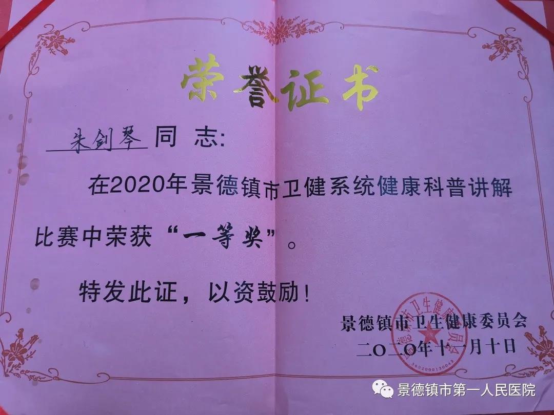 热烈祝贺我院感染科护理组荣获"江西省三八红旗手(集体)"光荣称号!护士长刘田凤代表领奖,并与省三八红旗手获奖者一起受到市主要领导的亲切接见。市领导特意嘱托转达,向一院全院职工表示慰问,感谢一院全院职工在疫情期间的辛勤付出! 恭喜我院检验科医师徐冉的论文获江西省医学会检验医学分会2020年学术年会优秀论文三等奖! 11月10日下午,景德镇市卫健委成功举办卫健系统健康科普大赛。全市卫健系统17名参赛选手参加了比赛。我院呼吸内科朱剑琴同志以《锦衣玉食养好肺》为题,通俗易懂地讲述了如何通过“禁、衣、运、食”四个方面去改善肺功能,呼吁大家共同关注肺健康,最终荣获一等奖!