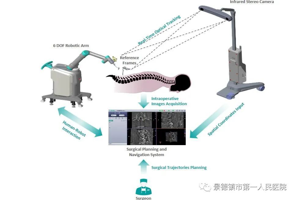 12月24日,景德镇市第一人民医院成功开展了赣东北首例机器人腰椎管狭窄后路减压加椎弓根螺钉固定术,手术由骨二科负责人袁志峰与“新同事”——世界先进创伤及脊柱骨科手术机器人天玑®“并肩”完成。“新同事”身价一千五百万元,这台“人机联合”手术的成功开展不仅对于我院具有里程碑式的意义,对于景德镇地区整体医疗的高端带动意义更是不言而喻,是赣东北地区公立医院智慧发展、联通医疗的划时代举措。 天玑®是目前国内唯一获得CFDA认证的第三代骨科手术机器人,实时追踪可达到亚毫米级精度,也就是说外科医生可以远离手术台操纵机器进行手术,且手术创口小,出血量小,可有效降低手术风险、减少手术并发症。 天玑®骨科手术机器人广泛应用于脊柱外科、创伤骨科,据悉,目前江西省内仅有三台,赣东北地区仅此一台。工欲善其事,必先利其器。学科建设始终追求高精尖科技前沿的景德镇市第一人民医院,必将发挥优势引领瓷都医疗技术不断向前发展。 手术过程是医生主导、机器人辅助,协同保障手术成功。在手术开始前,袁志峰首先根据患者的适应症选择2D(或3D)模式完成手术规划,随后,天玑®机器人精确运动至规划位置,并实时监测患者移动,自我修正,监控实时数据显现,手术路径与规划路径一致。 天玑®机器人的精准高效,可以有效减少手术过程中出现手术部位周围神经组织损伤的问题。引进高端机器人设备,是景德镇市第一人民医院近年来不断优化软件(人才建设)强化硬件(先进仪器)打造智慧医院的一个剪影。 12月25日早上,骨二科病区内袁志峰正在查房,患者恢复状况良好。该男性患者52岁,反复腰痛伴右下肢麻痛10年,加重伴活动受限2周,在其他医院医治无效,为求进一步治疗来到我院就诊。 患者之前抬脚(腿)活动受限,疼痛感强烈,术后第二天在医生的引导下,能自行在病床上做抬腿(康复)运动。患者的家属满脸笑意,不停地夸赞“年轻的医生,技术好”“医生人好,一院好”! 天玑®