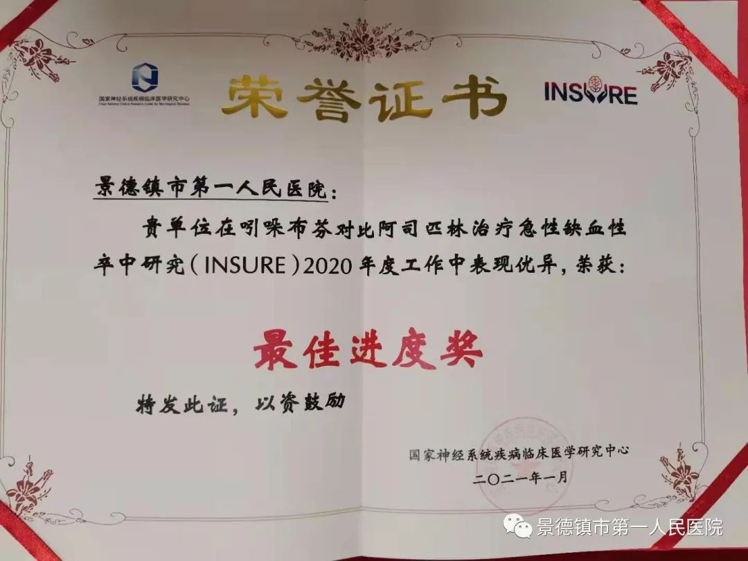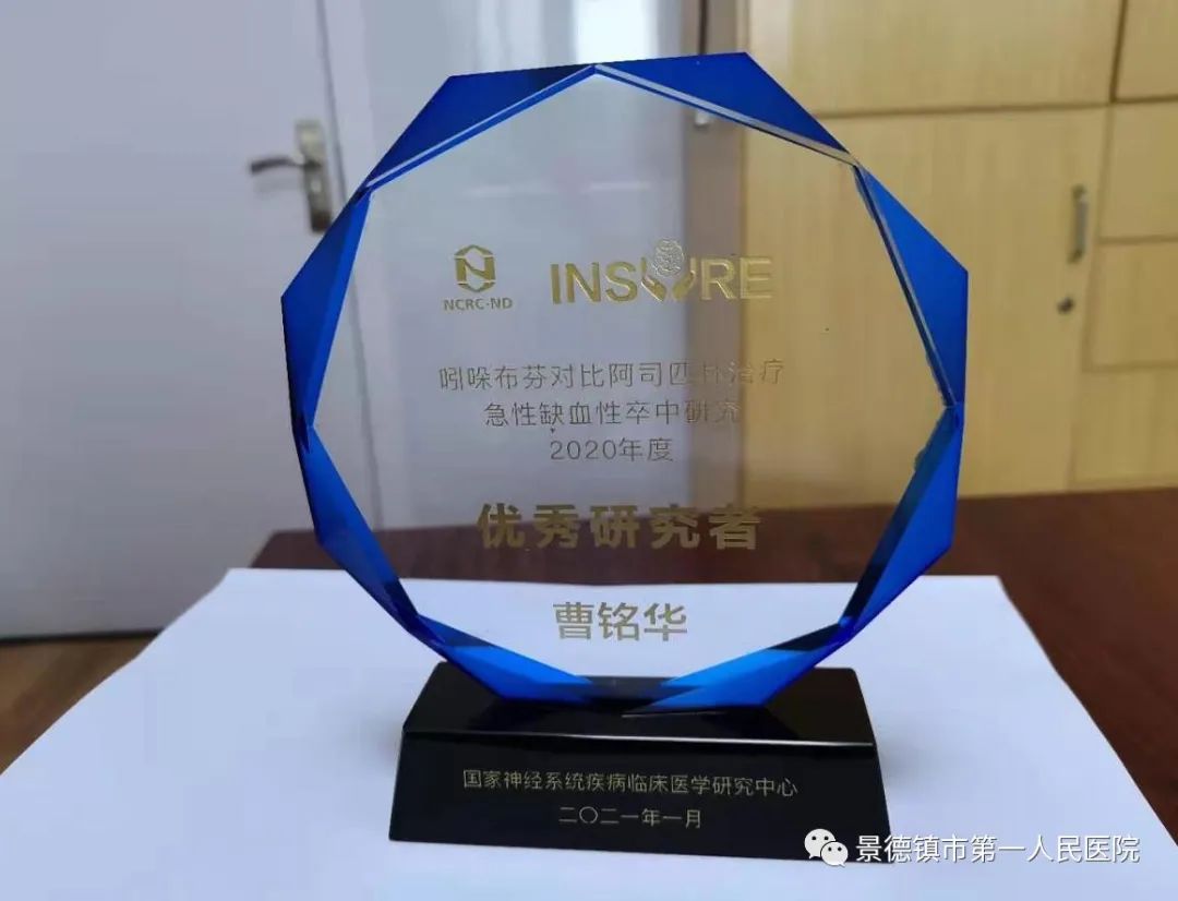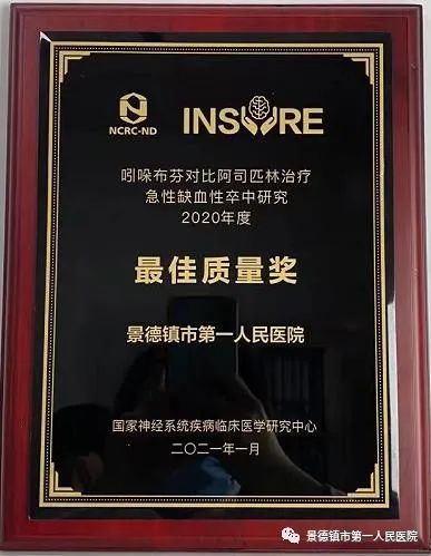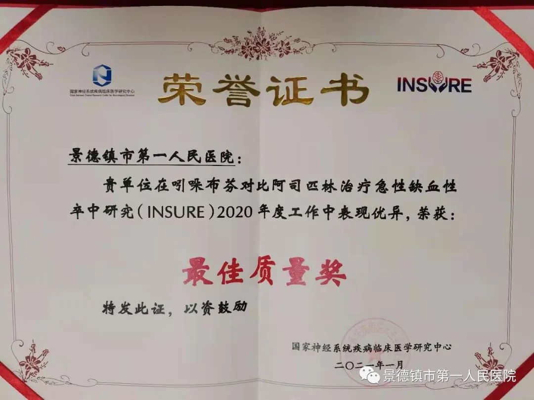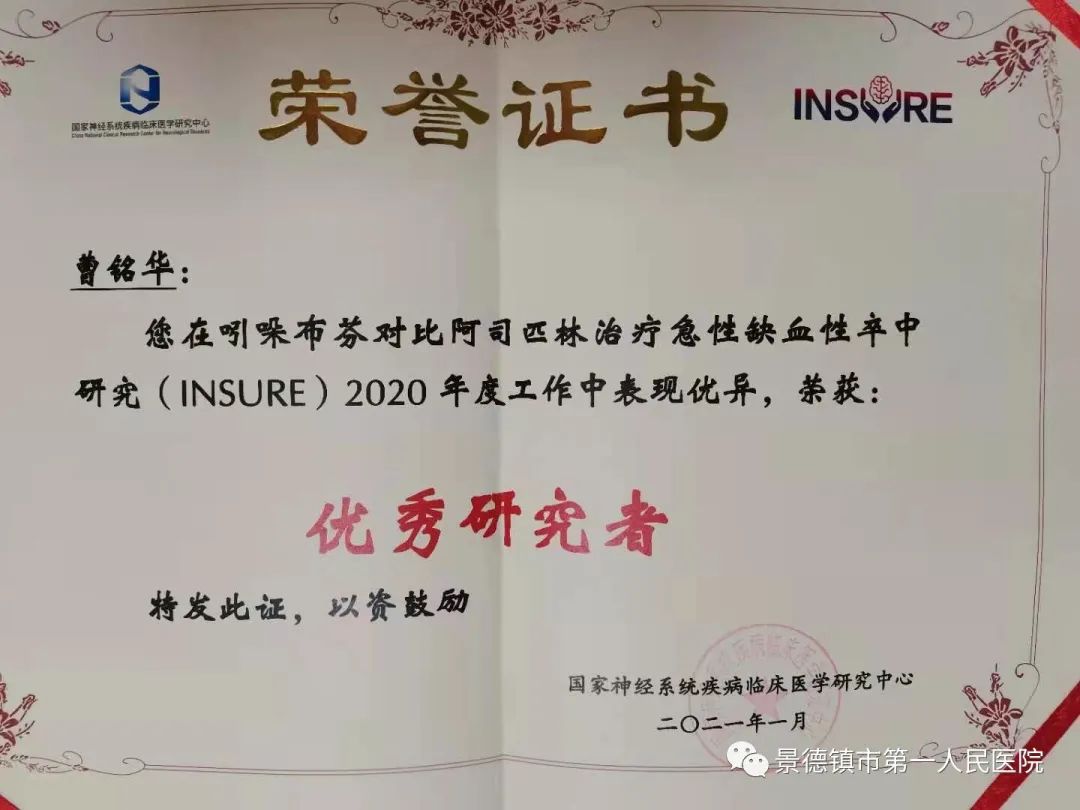 喜讯!景德镇市第一人民医院获国家神经系统疾病临床医学研究中心颁发的吲哚布芬对比阿司匹林治疗急性缺血性卒中研究(INSURE )2020年度“最佳质量奖”、“最佳进度奖”,神经内科主任曹铭华因在吲哚布芬对比阿司匹林治疗急性缺血性卒中研究(INSURE )2020年度工作中表现优异,获评“优秀研究者奖”。