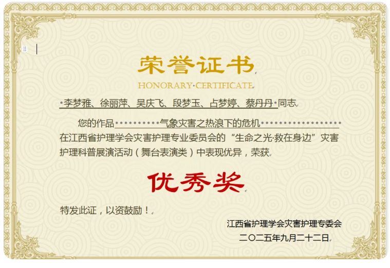 9月21日,在江西省护理学会灾害护理专业委员会举办的“生命之光·救在身边”灾害护理科普展演活动(舞台表演类)中,由市一院呼吸与危重症医学科与感染内科联合创编参演的舞台剧作品——《气象灾害之热浪下的危机》,凭借其专业的护理内涵、生动的舞台表现力,在比赛中表现优异,被评为“优秀奖”!